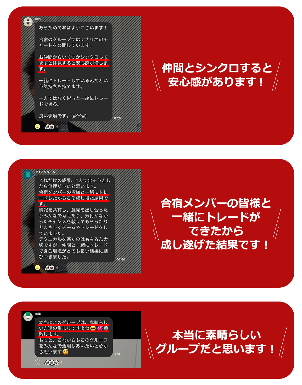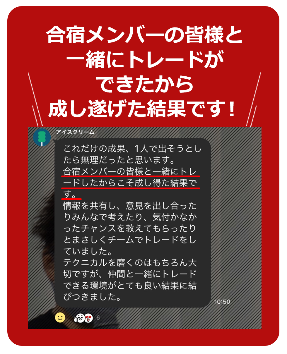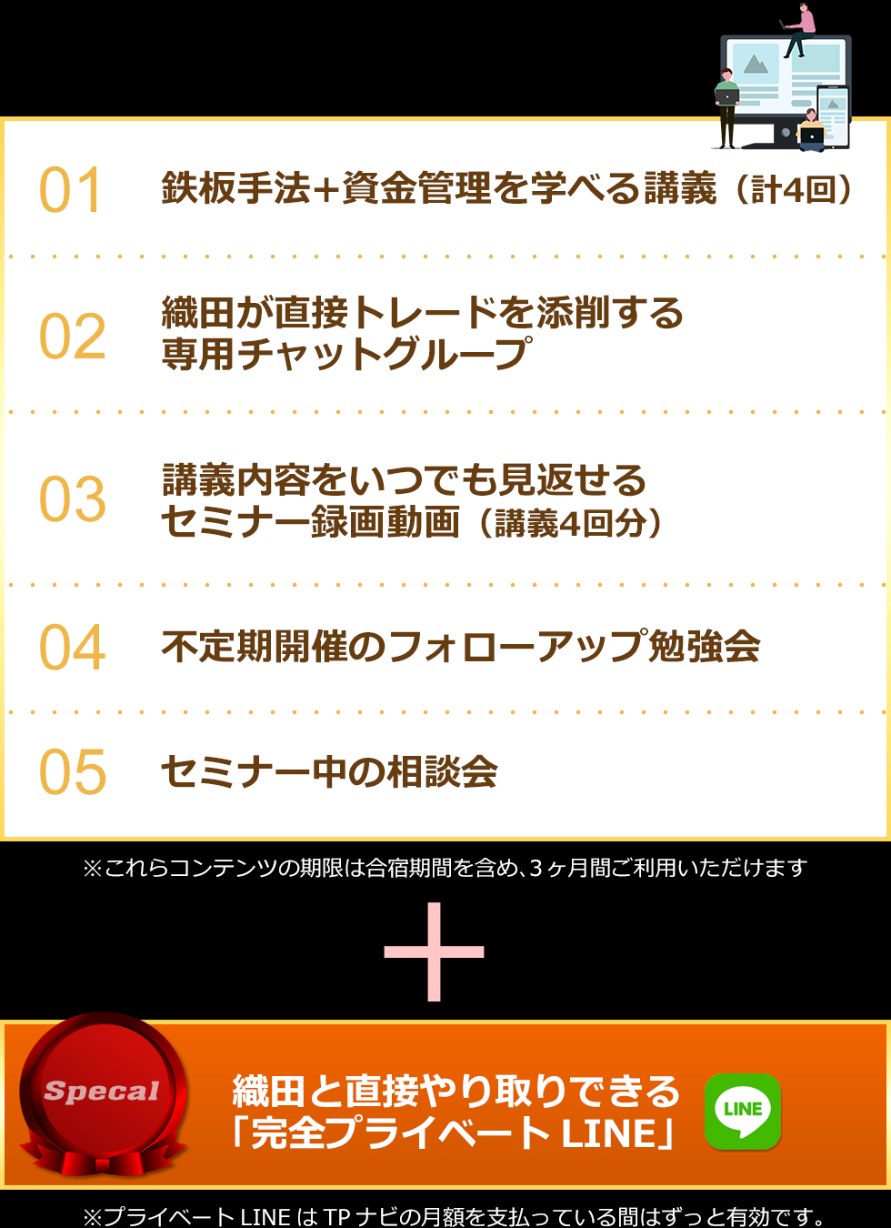 つまり、合宿が終わった後も、億トレーダーのマンツーマン指導を永久に受けられるということです。