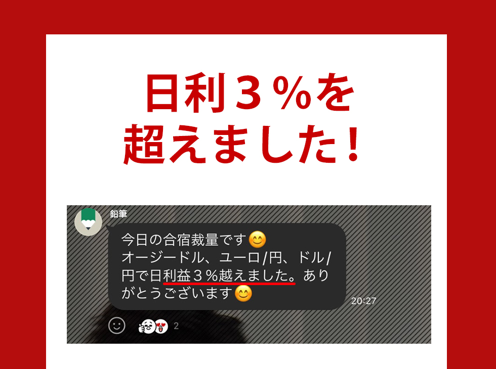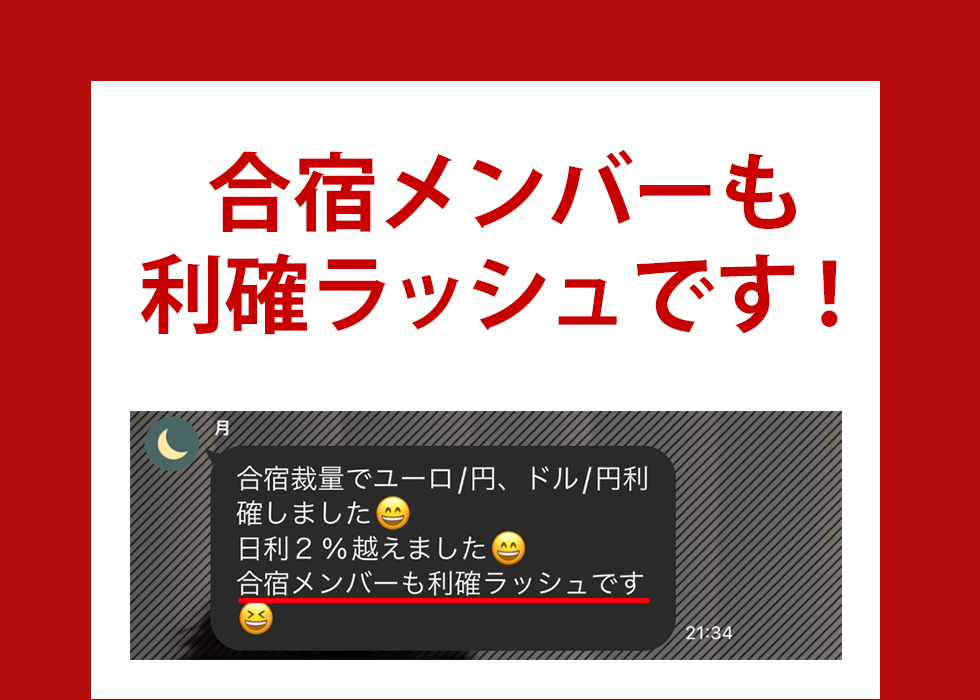つまり、相場がどんな状況でも、鉄板で「こう動く」と分かっている波動があり、この合宿に参加することで、あなたは、その波動を取りにいくことが可能になります。